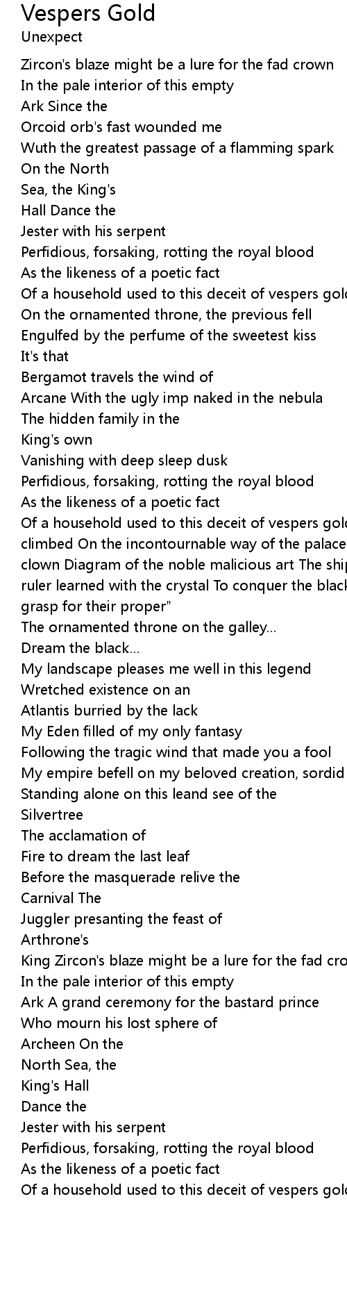 | Of a household used to this deceit of vespers gold "Thus the glorious vessel climbed On the incontournable way of the palace In the chaos of the grotesque clown Diagram of the noble malicious art The ship strugglin into horror The ruler learned with the crystal To conquer the black ice of punishment The stars grasp for their proper" | |