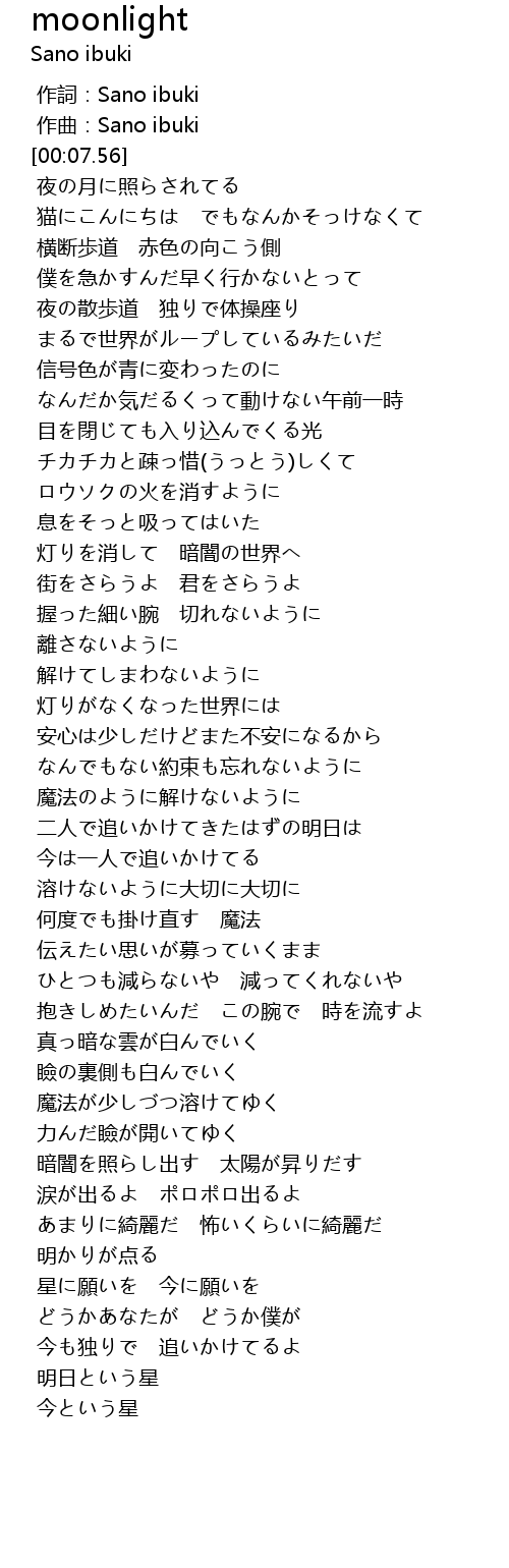 | [01:00.35] | 夜の散歩道 独りで体操座り |