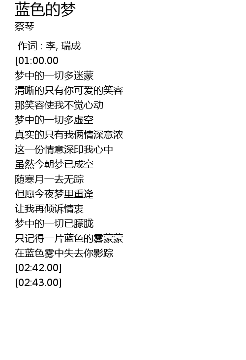 | [02:08.00][01:00.00][00:26.00] | 昨夜的一场蓝色的梦 |