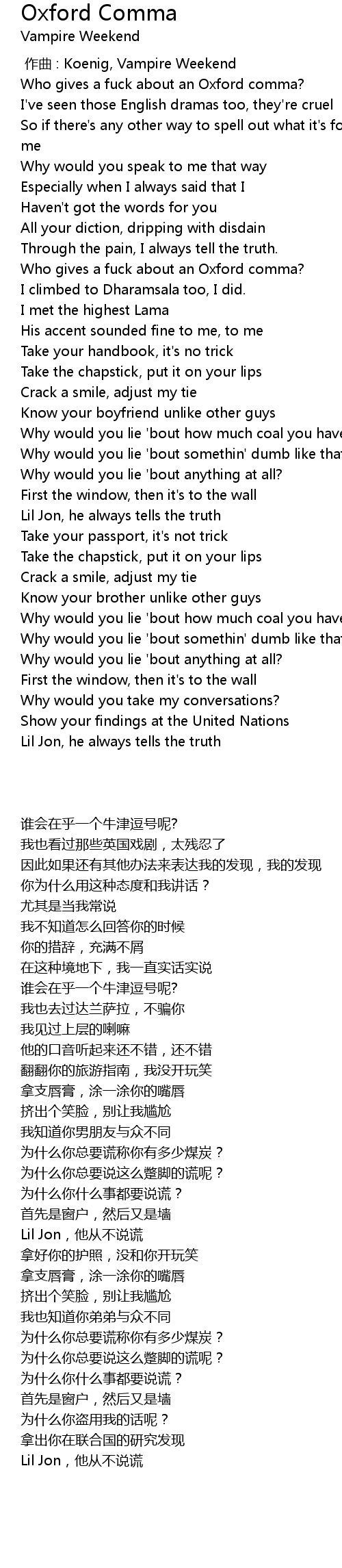 | [00:17.47] | Who gives a fuck about an Oxford comma? |