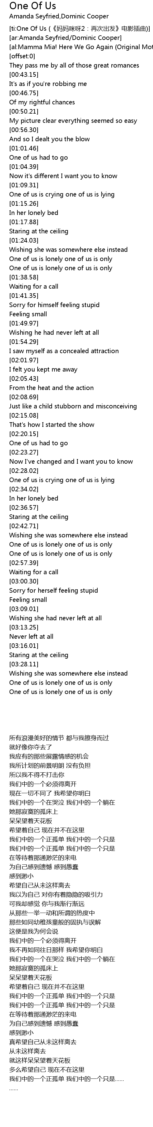 | [ti:One Of Us (《妈妈咪呀2:再次出发》电影插曲)] | |