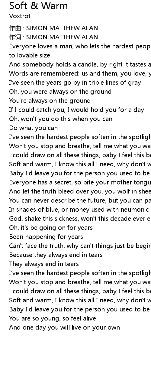 | Soft and warm, I know this all I need, why don' t we learn to grieve | |