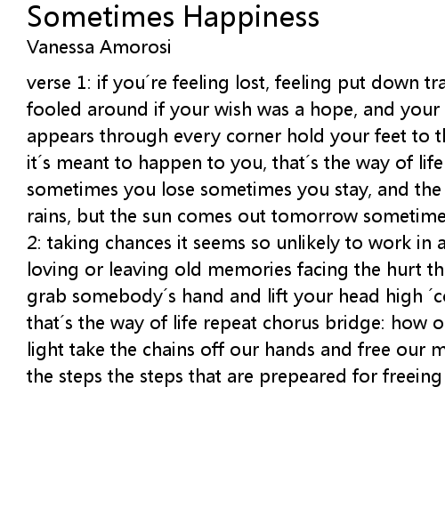 | verse 1: if you re feeling lost, feeling put down trapped in a mess, or just fooled around if your wish was a hope, and your hope was desire when disaster appears through every corner hold your feet to the ground and close your eyes if it s meant to happen to you, that s the way of life chorus: sometimes you win, sometimes you lose sometimes you stay, and the other times you move sometimes it rains, but the sun comes out tomorrow sometimes happiness sometimes sorrow verse 2: taking chances it seems so unlikely to work in a way that you need it to loving or leaving old memories facing the hurt that is trapped in remembering grab somebody s hand and lift your head high cos if you re meant to be hurt, that s the way of life repeat chorus bridge: how our hearts will find this light take the chains off our hands and free our minds for ever more following the steps the steps that are prepeared for freeing our souls repeat chorus |