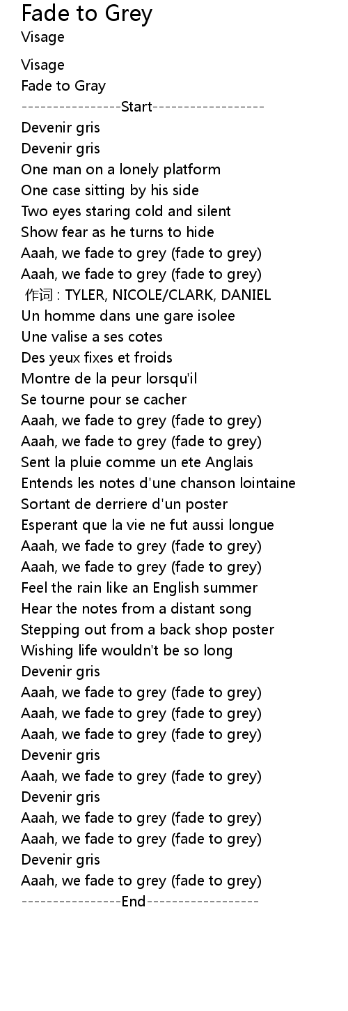 | [03:00.00] | Aaah, we fade to grey fade to grey |