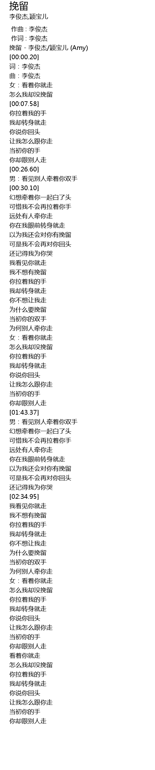| [00:00.10] | 挽留 - 李俊杰/颖宝儿 (Amy) |