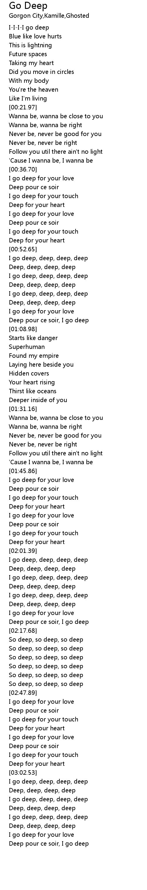 | [03:03.37] | I go deep, deep, deep, deep |