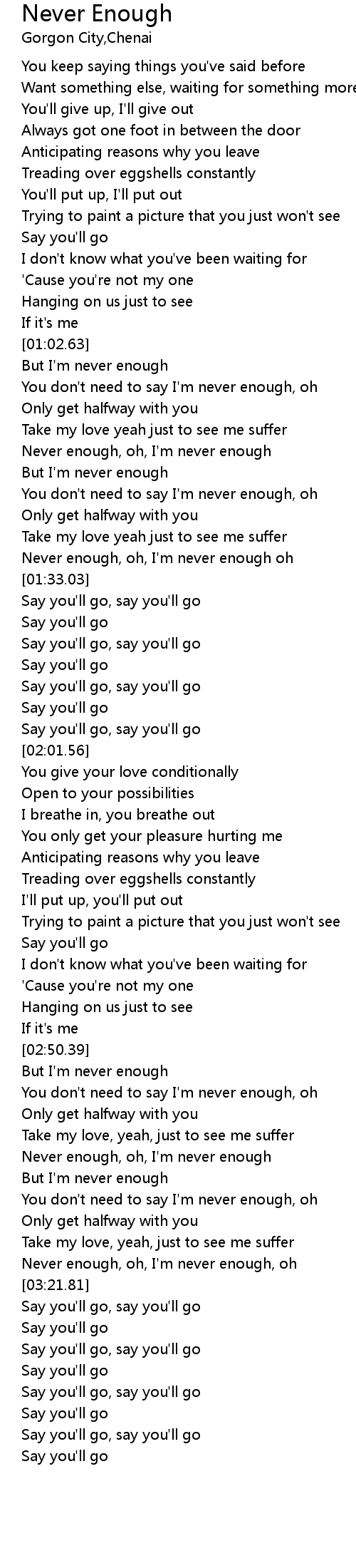 | [03:03.38] | Never enough, oh, I'm never enough |