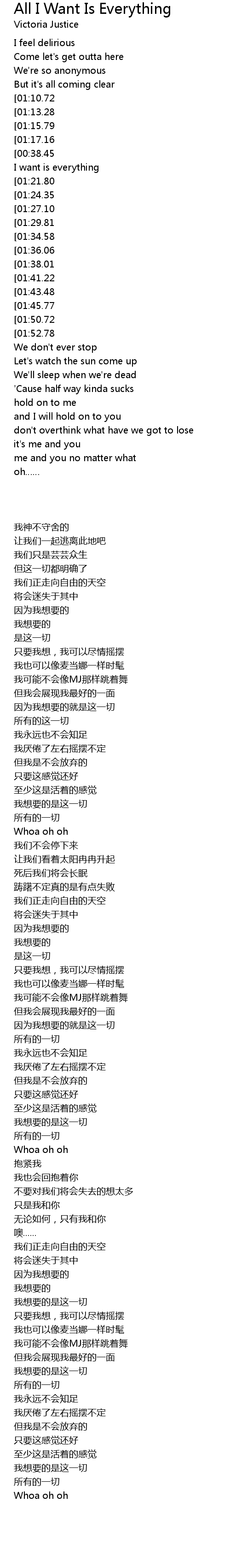 | [00:23.72][00:38.45][00:54.38][01:18.15][01:32.44][01:48.55][02:23.13][02:37.42][02:53.59] | All I want is everything |