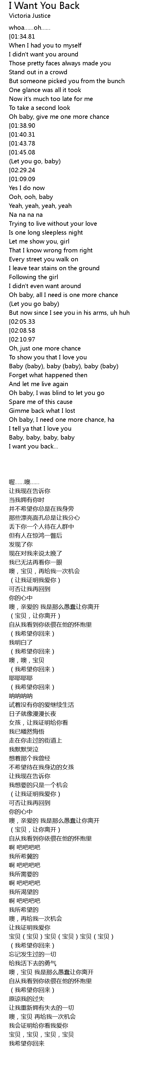 | [01:06.95][01:09.09][01:11.52][01:13.86][02:19.59][02:33.54] | (I want you back) |