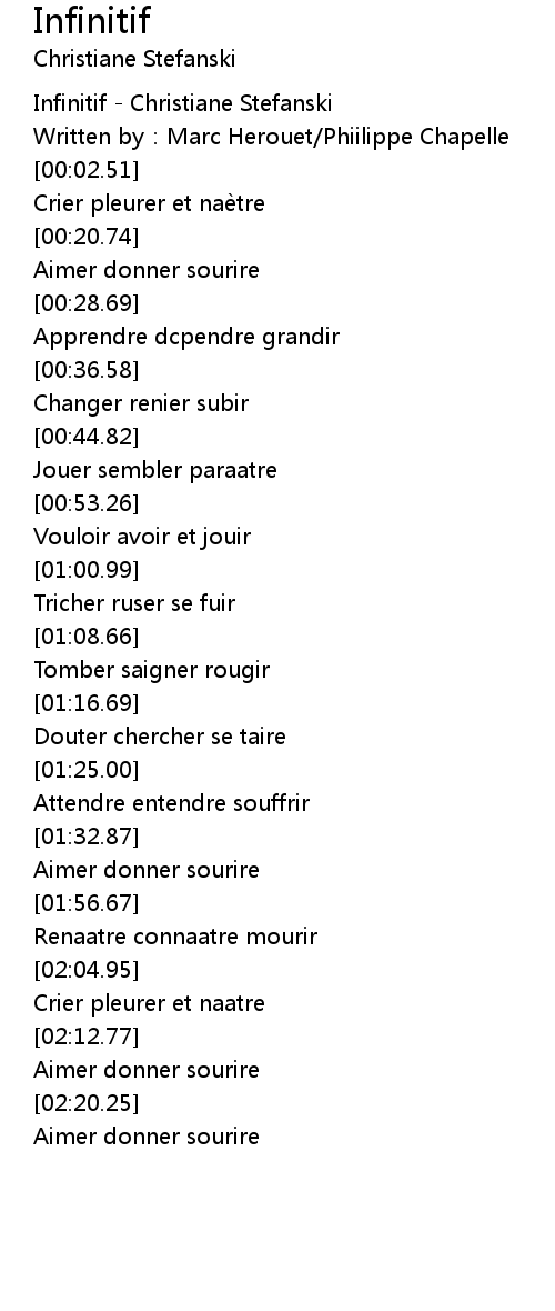 | [00:00.28] | Infinitif - Christiane Stefanski |