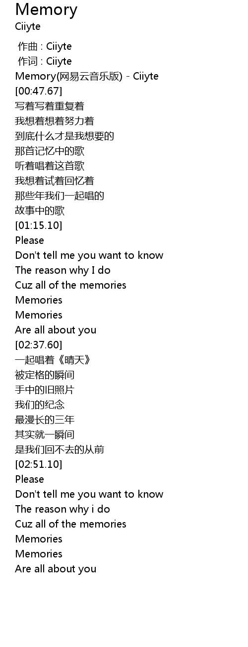 | [00:00.00] | Memory(网易云音乐版) - Ciiyte |