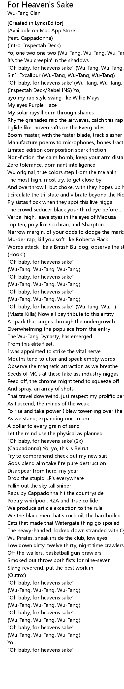 "Oh baby, for heavens sake" (Wu-Tang, Wu-Tang, Wu-Tang) |