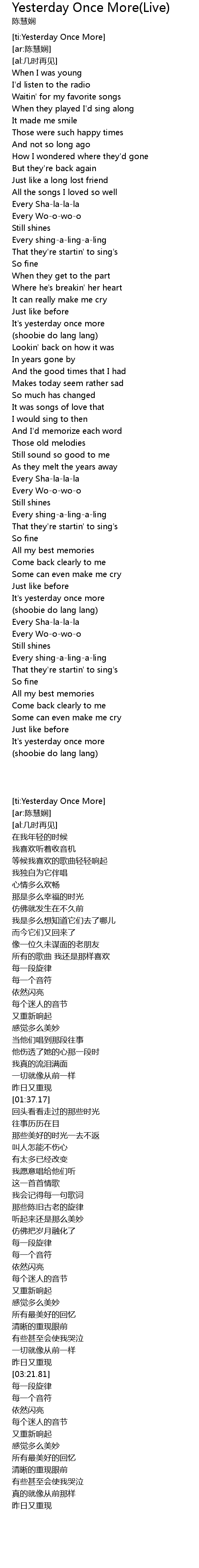 | [01:34.85] | It's yesterday once more |