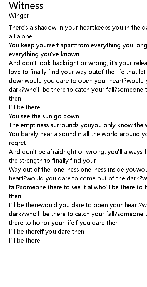 | And don't look backright or wrong, it's your release sodon't give upfind the love to finally find your way outof the life that let youlife that let you downwould you dare to open your heart?would you dare to come out of the dark?who'll be there to catch your fall?someone there to see it allif you dare then | |