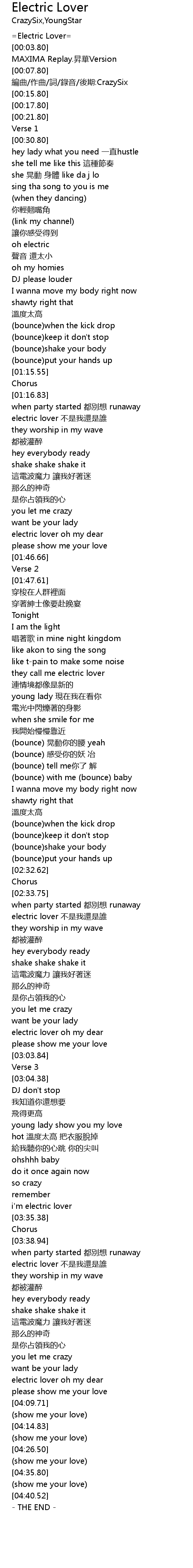| [00:00.80] | =Electric Lover= |