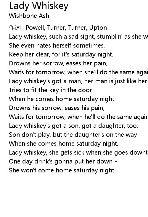 | Lady whiskey, such a sad sight, stumblin' as she walks. | |