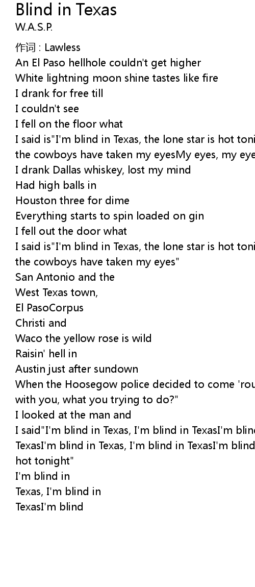 | I said is"I'm blind in Texas, the lone star is hot tonightI'm blind in Texas, the cowboys have taken my eyesMy eyes, my eyes" | |