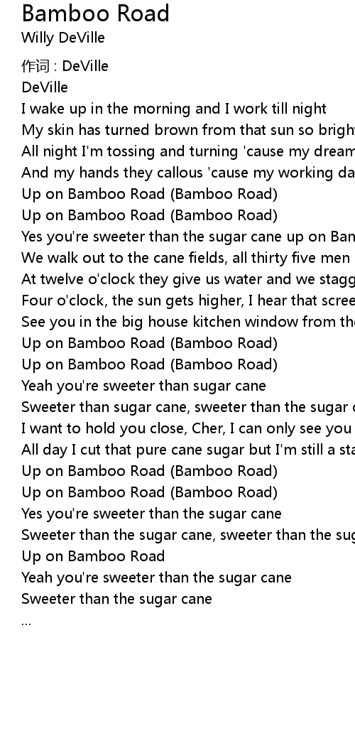 | Sweeter than the sugar cane, sweeter than the sugar cane up on Bamboo Road. | |
