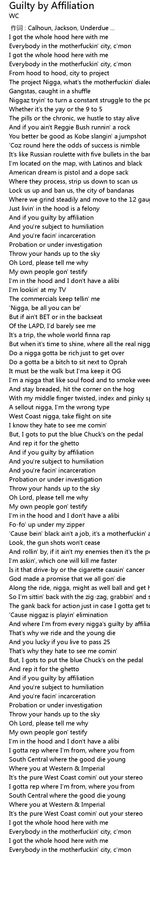 | [02:53.33] | And where I'm from every nigga's guilty by affiliation |