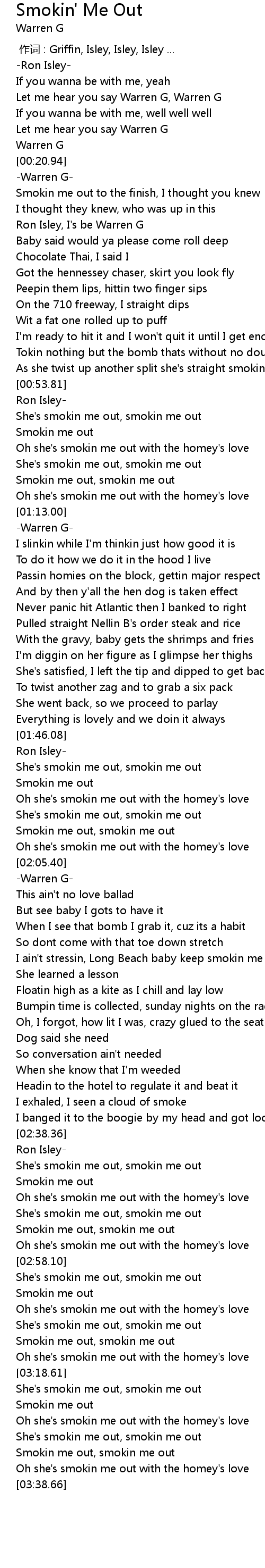 | [00:58.21] | Oh she's smokin me out with the homey's love |