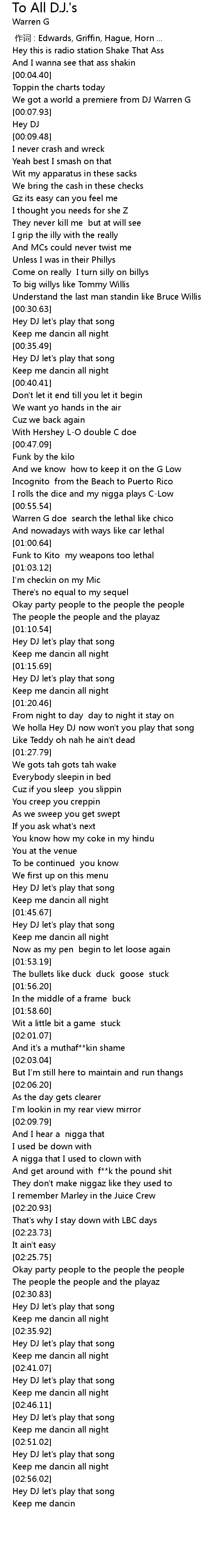 | [00:56.24] | Warren G doe search the lethal like chico |