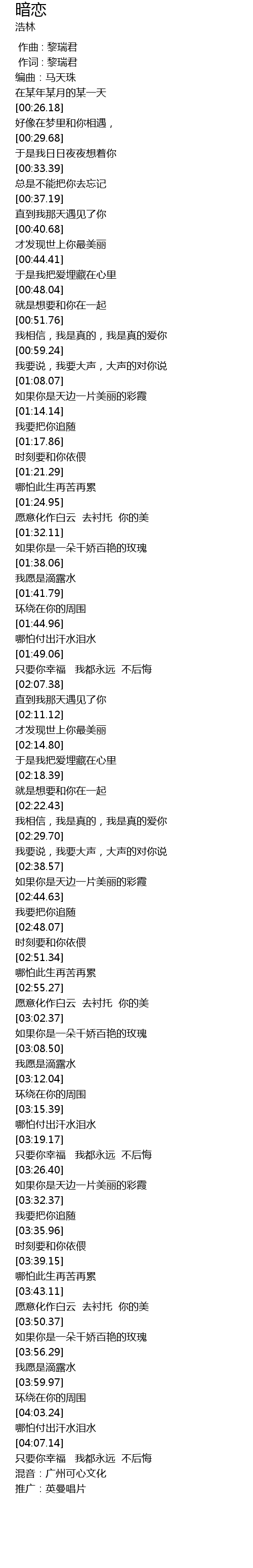 | [04:08.68] | 混音:广州可心文化 |