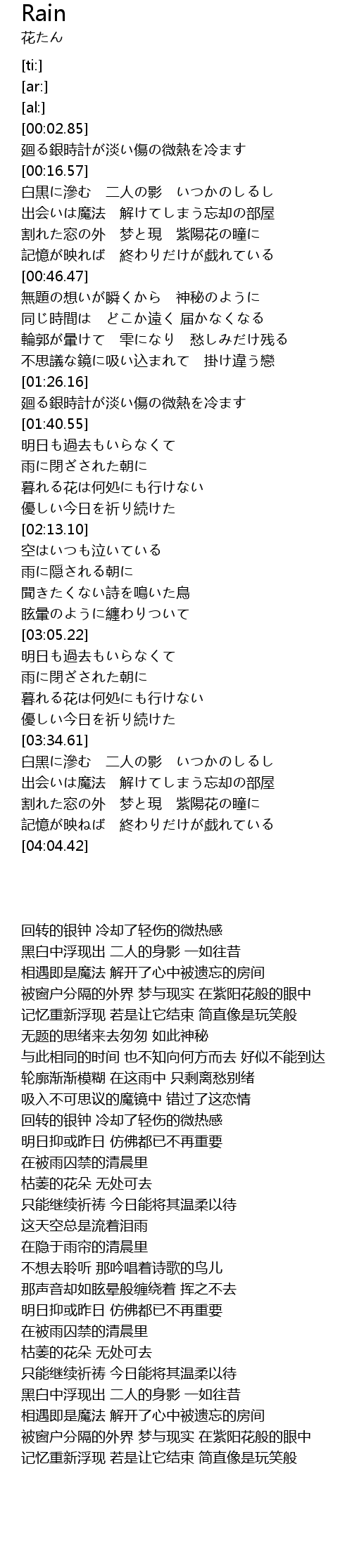 | [03:48.59] | 割れた窓の外 梦と現 紫陽花の瞳に |