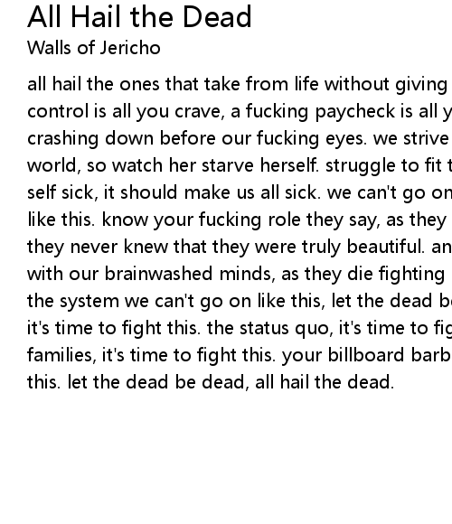 all hail the ones that take from life without giving back. what's ours is ours. control is all you crave, a fucking paycheck is all you are. our world is crashing down before our fucking eyes. we strive to be perfect in this imperfect world, so watch her starve herself. struggle to fit the mold, as she makes her self sick, it should make us all sick. we can't go on like this, we can't go on like this. know your fucking role they say, as they die fighting beauty. but they never knew that they were truly beautiful. and we can't go on like this. with our brainwashed minds, as they die fighting beauty. because we're slaves to the system we can't go on like this, let the dead be dead. you corporate fuck, it's time to fight this. the status quo, it's time to fight this. our broken families, it's time to fight this. your billboard barbie, it's time to fight this. let the dead be dead, all hail the dead. |