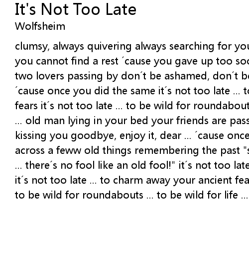 | clumsy, always quivering always searching for your things you don t work, but you cannot find a rest cause you gave up too soon old man sitting in your trap two lovers passing by don t be ashamed, don t be upset, enjoy it, dear ... cause once you did the same it s not too late ... to charm away your ancient fears it s not too late ... to be wild for roundabouts ... to be wild for life ... old man lying in your bed your friends are passing by it s just a rule, kissing you goodbye, enjoy it, dear ... cause once you did the same i came across a feww old things remembering the past " spare the rod and spoil the child ... there s no fool like an old fool!" it s not too late ... to start again it s not too late ... to charm away your ancient fears it s not too late ... to be wild for roundabouts ... to be wild for life ... |