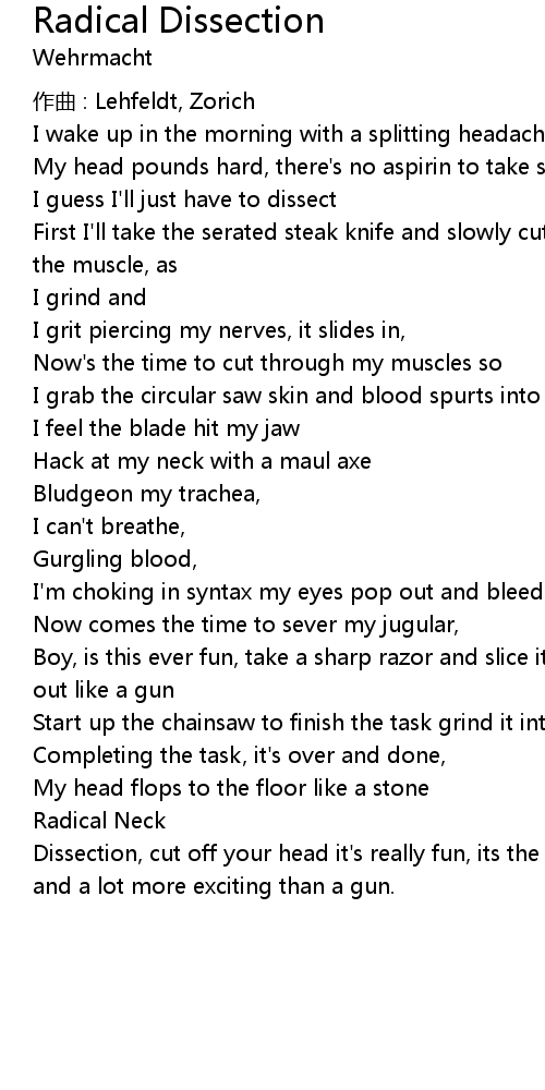 | Dissection, cut off your head it' s really fun, its the best hangover prevention, and a lot more exciting than a gun. |