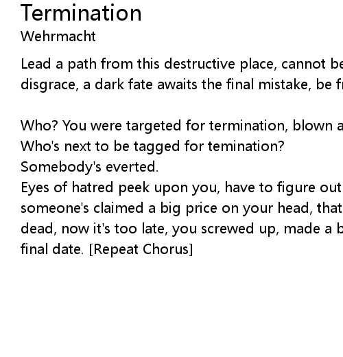 Eyes of hatred peek upon you, have to figure out a way to get fuckin' through, someone's claimed a big price on your head, that someone wants you face down dead, now it's too late, you screwed up, made a big mistake, death gave you the final date. [Repeat Chorus] |