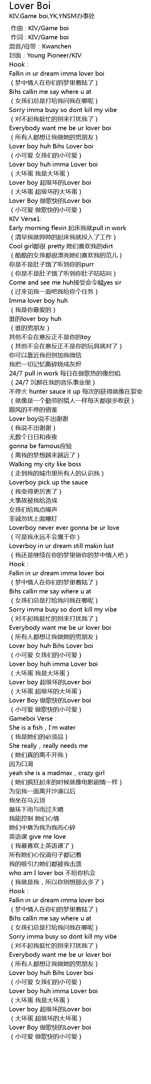 | [01:35.462] | Everybody want me be ur lover boi |