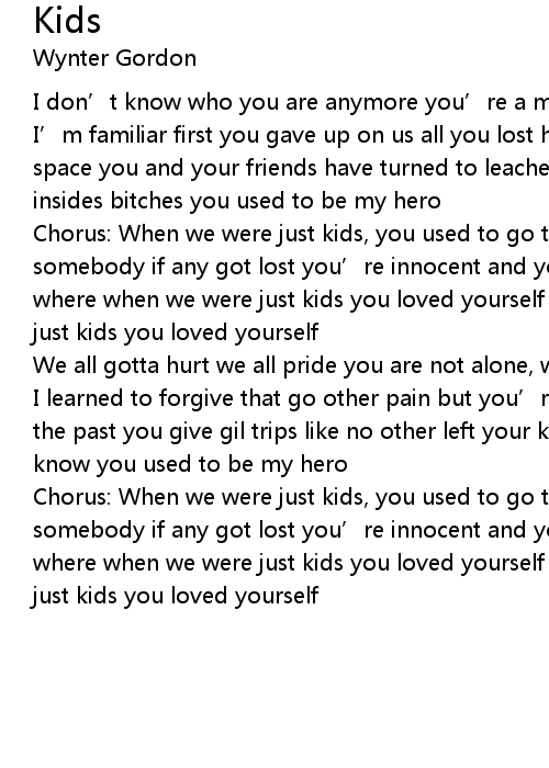 | Chorus: When we were just kids, you used to go to throw up and be, to be somebody if any got lost you’re innocent and you don’t remember wearing where when we were just kids you loved yourself you loved yourself when we were just kids you loved yourself |