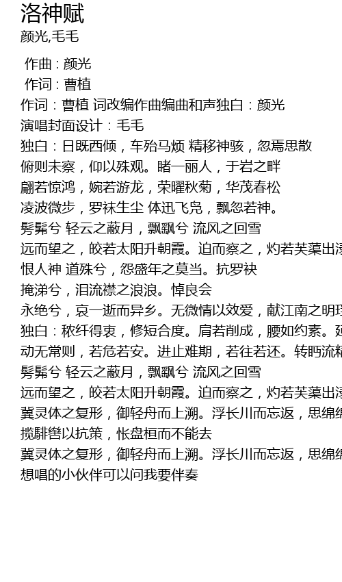 | [00:00.755] | 作词:曹植 词改编作曲编曲和声独白:颜光 |