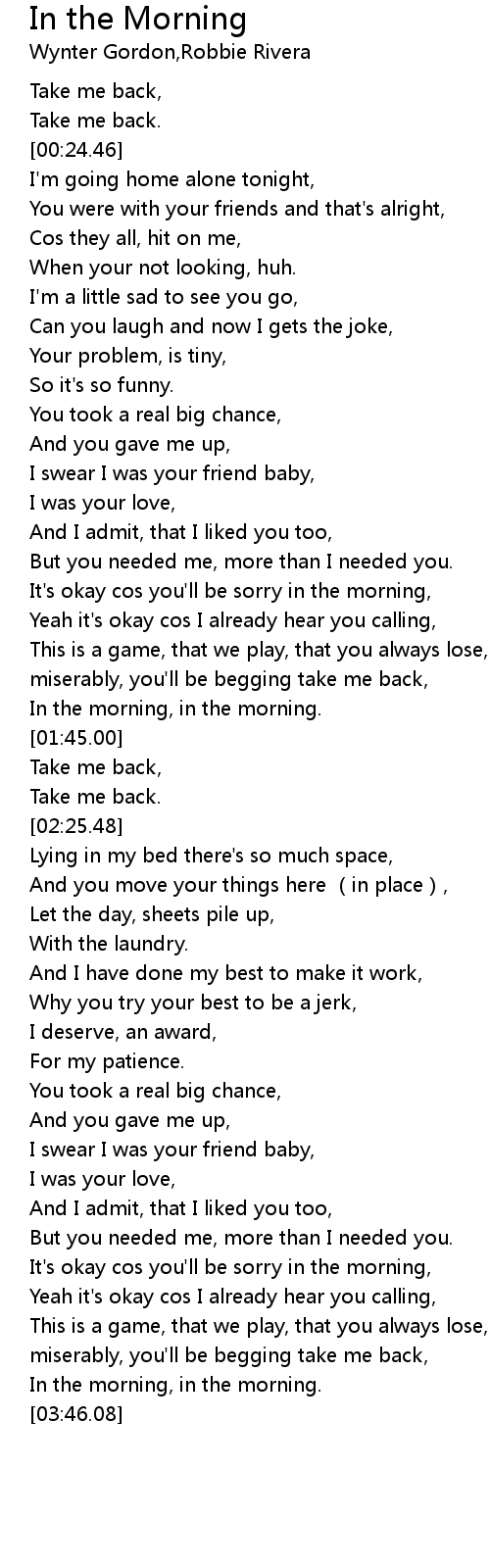 | [01:14.87] | It's okay cos you'll be sorry in the morning, |