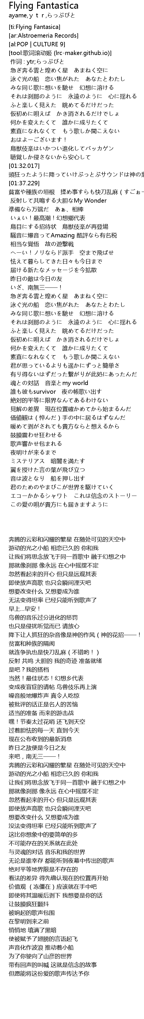 | [01:57.506] | へーい!ノリならド派手 空まで飛ばせ |