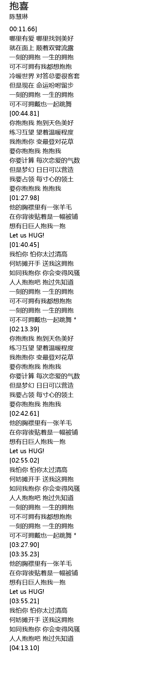 | [04:08.84] | 人人抱抱吧 抱过先知道 |