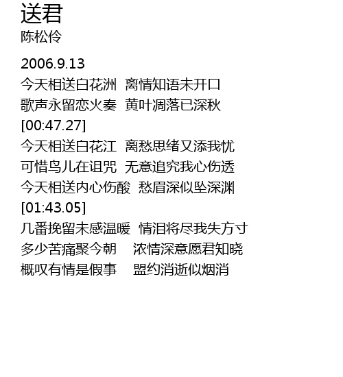 | [00:10.58] | 今天相送白花洲 离情知语未开口 |