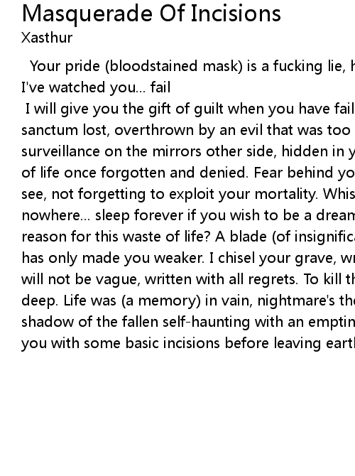 I will give you the gift of guilt when you have failure to answer to. Inner sanctum lost, overthrown by an evil that was too real to be untrue... I was the surveillance on the mirrors other side, hidden in your mind, reflecting the lies of life once forgotten and denied. Fear behind your rage, it's all that I can see, not forgetting to exploit your mortality. Whispers chant from the depths of nowhere... sleep forever if you wish to be a dreamer. Is your fear of death a reason for this waste of life? A blade (of insignificance) which hasn't killed has only made you weaker. I chisel your grave, written in life's defects... it will not be vague, written with all regrets. To kill the pain, cut twice as deep. Life was (a memory) in vain, nightmare's the final sleep. A re-created shadow of the fallen self-haunting with an emptiness beyond the dark. To leave you with some basic incisions before leaving earth... |