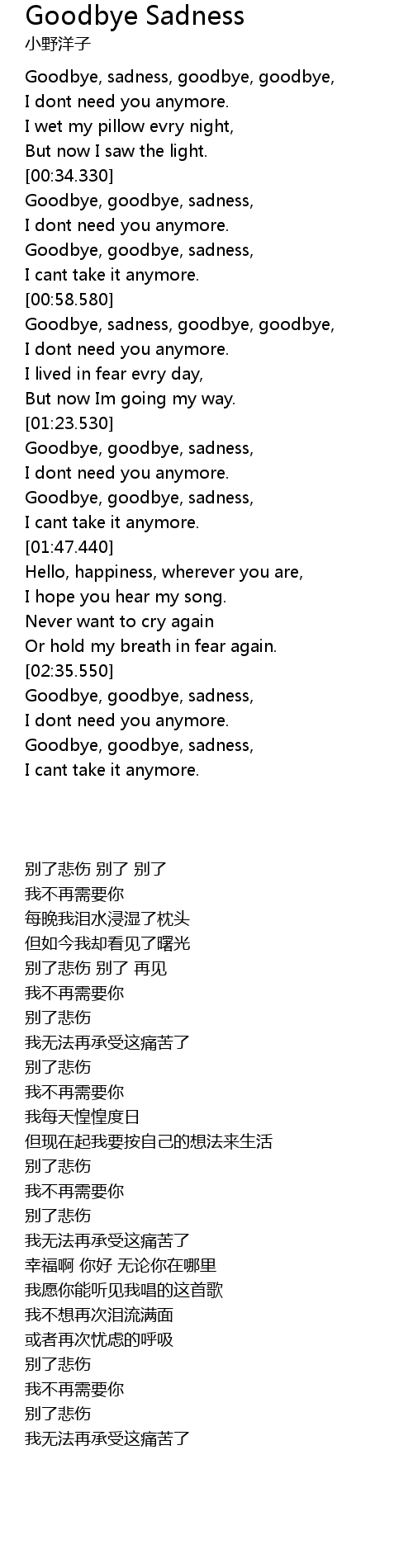 | [00:36.220] | Goodbye, goodbye, sadness, |