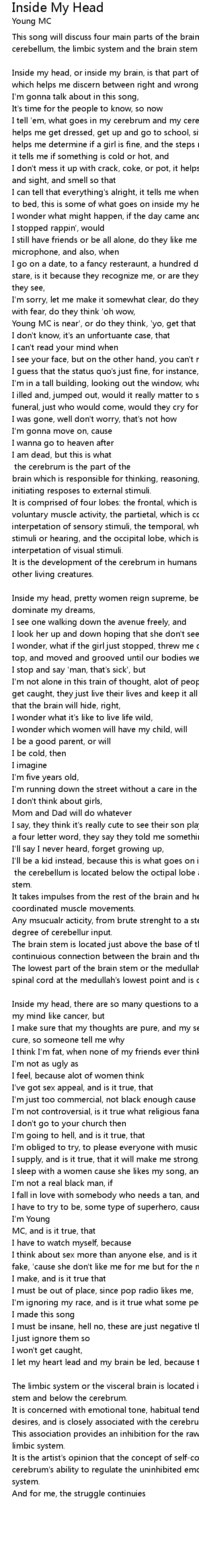I goes on inside my head [Chours 2: spoken] the cerebrum is the part of the brain which is responsible for thinking, reasoning, problem solving, and initiating resposes to external stimuli. |