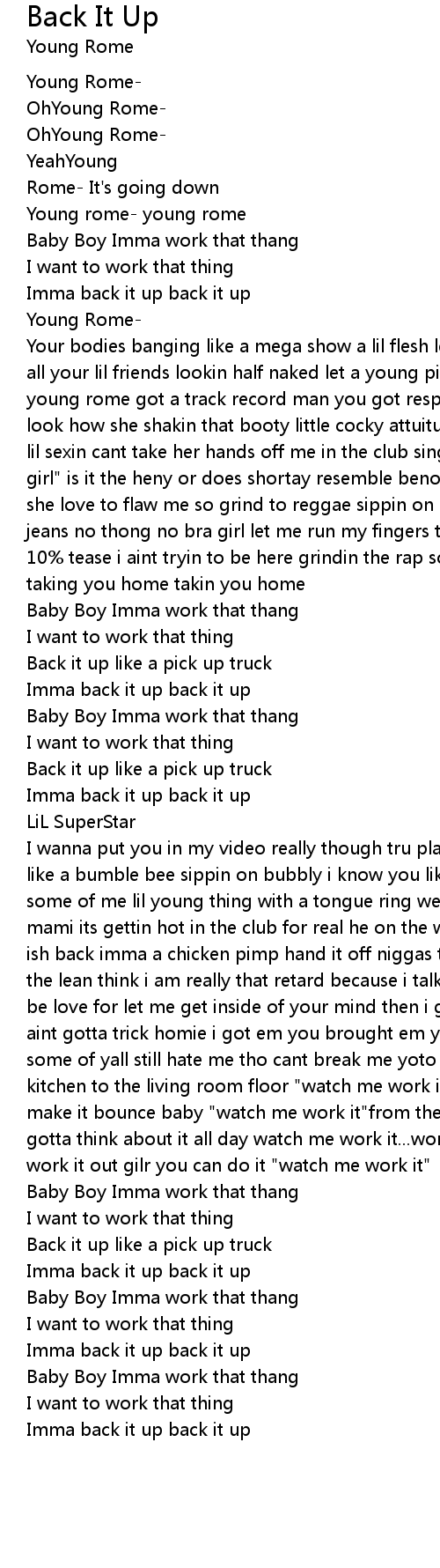 I wanna put you in my video really though tru player really know got you buzzing like a bumble bee sippin on bubbly i know you like to drink but you rather have some of me lil young thing with a tongue ring we about to get into somethang mami its gettin hot in the club for real he on the wheels of steel bring that ish back imma a chicken pimp hand it off niggas think my toe broke i walk with the lean think i am really that retard because i talk low or slow what i gotta be love for let me get inside of your mind then i get up in them demin bottoms i aint gotta trick homie i got em you brought em yougn rome about that paper yo some of yall still hate me tho cant break me yoto the window to the wall to the kitchen to the living room floor "watch me work it" bounce baby make it bounce make it bounce baby "watch me work it"from the bedroom to the highway lil mama gotta think about it all day watch me work it...work it out girl you can do it work it out gilr you can do it "watch me work it" |