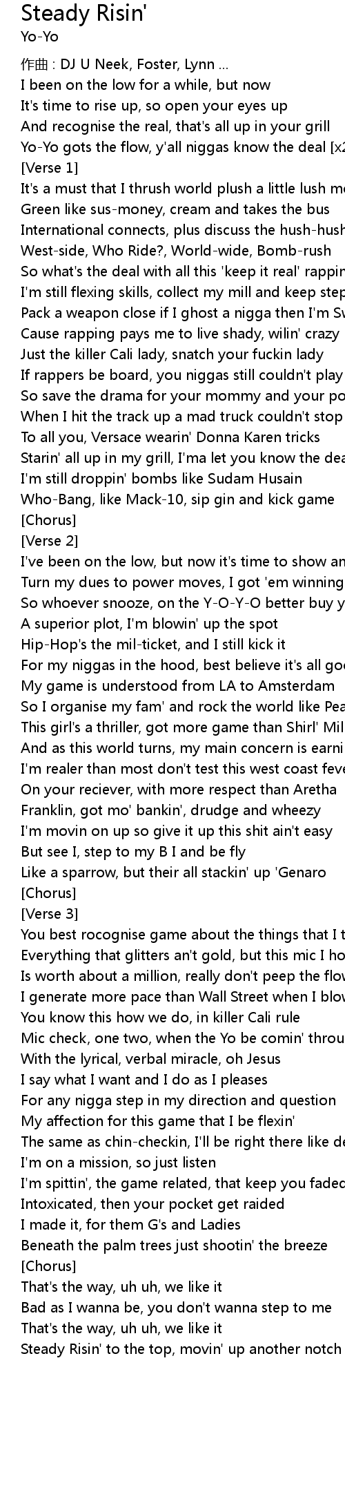 | Steady Risin' to the top, movin' up another notch x2 | |