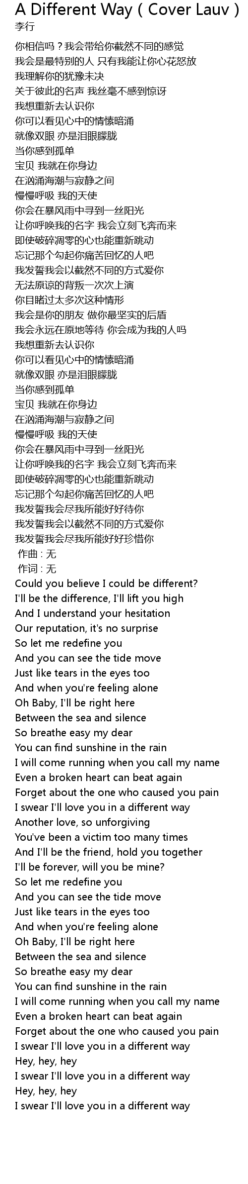 | [02:23.99] | I swear I'll love you in a different way |