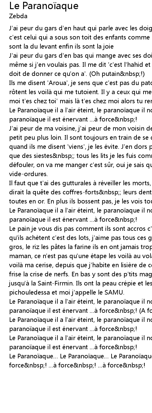 | Le Parano aque il a l' air e teint, le parano aque il nous croit hautain, le parano aque il est e nervant ...a force nbsp! A force | |