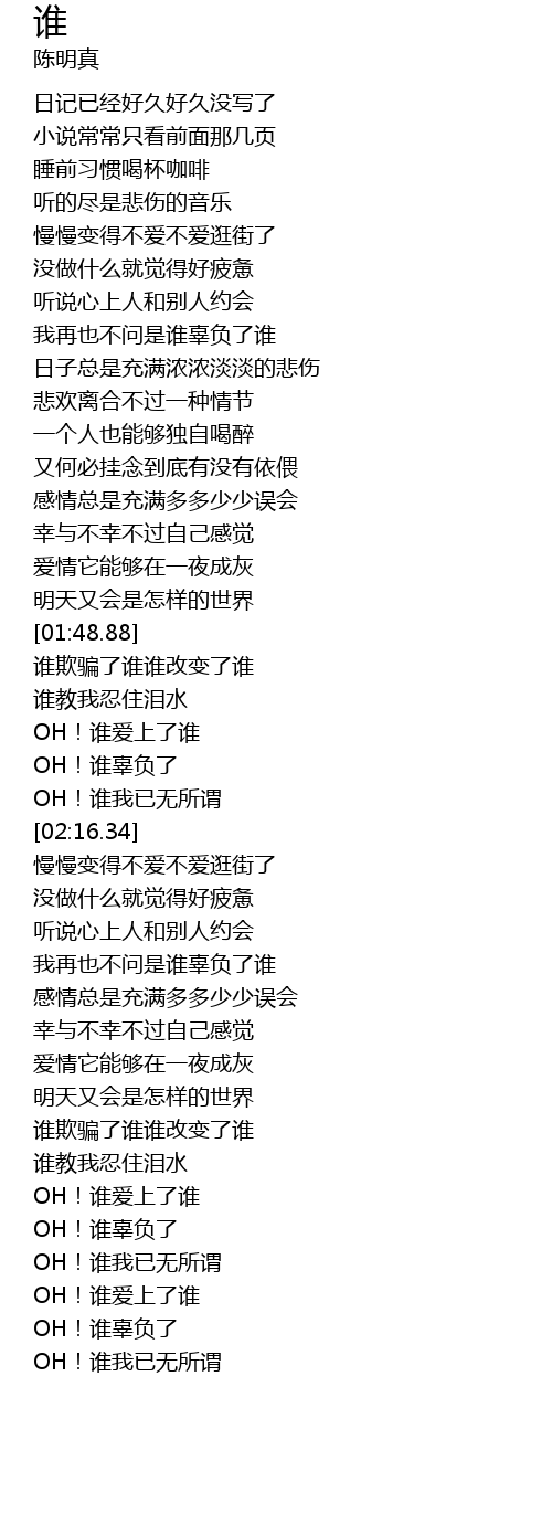 | [01:51.11] | shuí qī piàn le shuí shuí gǎi biàn le shuí |