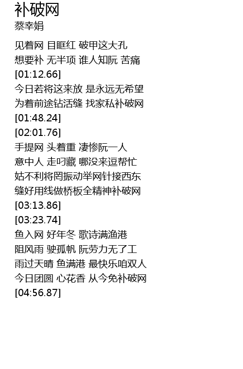 | [04:39.59] | 今日团圆 心花香 从今免补破网 |