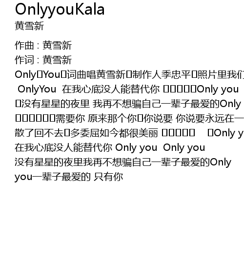 | Only You 词曲唱黄雪新 制作人季忠平 照片里我们多甜蜜 还记得你说要永远在一起 掏空心爱全给了你怎能说忘记就忘记OnlyYou OnlyYou 在我心底没人能替代你 Only you Only you 没有星星的夜里 我再不想骗自己一辈子最爱的Only you 需要你 原来那个你 你说要 你说要永远在一起 深深爱 散了回不去 多委屈如今都很美丽 Only you Only you 在我心底没人能替代你 Only you Only you 没有星星的夜里我再不想骗自己一辈子最爱的Only you一辈子最爱的 只有你 |
