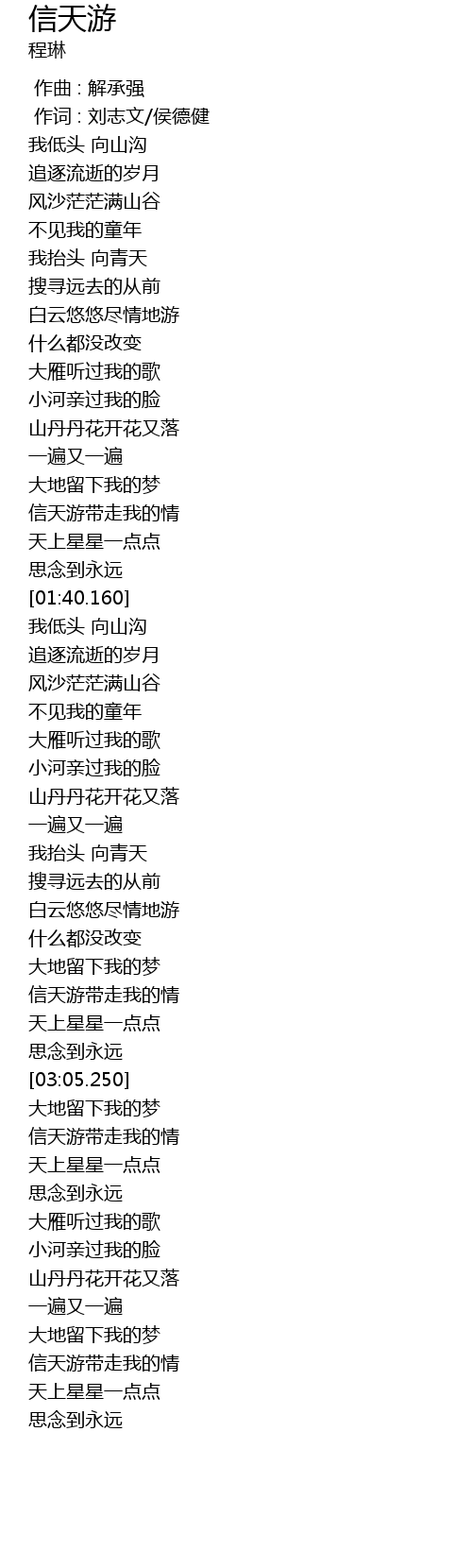| [01:30.350] | xìn tiān yóu dài zǒu wǒ de qíng |