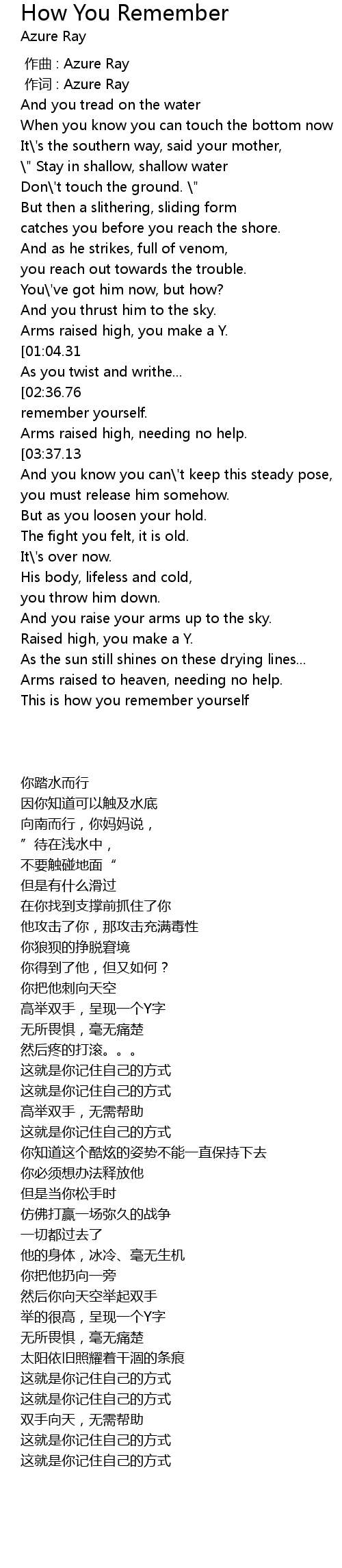 | [02:48.06][02:36.76][02:25.73][01:33.76][01:21.90][01:15.52] | This is how you remember yourself. |